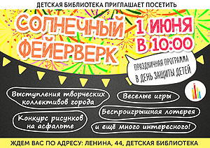 1 июня, в 10:00, на площадке перед Детской библиотекой состоится праздничная программа «Солнечный фейерверк», посвященная Дню защиты детей.