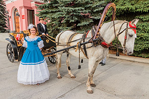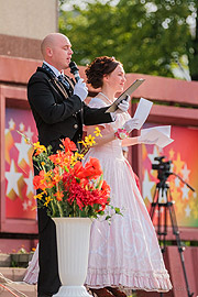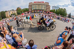 Почётными гостями первого в Снежинске «Летнего бала цветов» стали глава Снежинского городского округа Анатолий Тимошенков и протоиерей Павел Федосов. Их появление зрители наблюдали с замиранием сердца: под звуки полонеза по площади им. Ленина ехала карета, запряжённая белоснежной лошадью, и в ней находились глава города и батюшка в сопровождении детей.