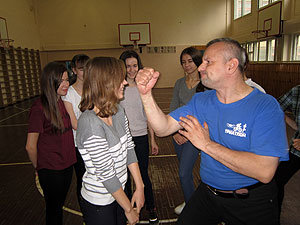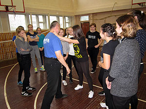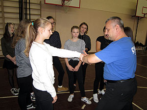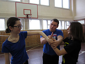 С женской половиной класса работал инструктор МБУ «ФСЦ» Константин Владимирович Усачев (тренер по айкидо, черный пояс 3-й дан). В программу женской самообороны входило: освобождение от разных захватов, уход с линии атаки противника и ознакомление с наименее защищенными зонами нападающего.