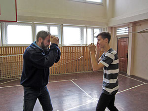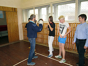 У юношей была проведена небольшая тренировка по боксу под руководством преподавателя ОБЖ Александра Владимировича Бакаева: техника удара и упражнения на реакцию, ловкость, силу. Все, что нужно для ознакомления будущих выпускников, а в перспективе и защитников Родины, для умения дать отпор.