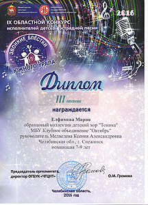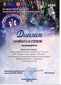 Поздравляем солистов образцового коллектива детский хор «Тоника» Дворца культуры «Октябрь»: диплом лауреата II степени – Мария Брылкина и диплом III степени – Мария Елфимова (хормейстер К. Медведева, концертмейстер О. Бойкова).