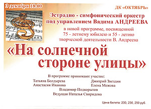 Новая концертная программа «На солнечной стороне улицы» посвящена 75-летнему юбилею и 55-летию творческой деятельности В.А. Андреева. Для вас прозвучат эстрадно-джазовые хиты прошлого века, популярная музыка из кинофильмов и мюзиклов.