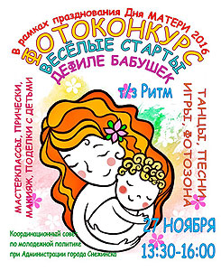 27 ноября в «Ритме», с 13:30 до 16:00, Координационный совет по молодёжной политике администрации города Снежинска проводит городской семейный праздник «Обнимая маму, обнимаешь мир!», посвященный празднованию международного Дня Матери.