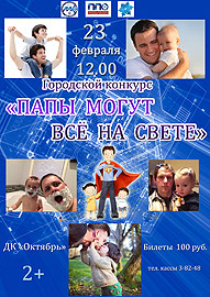 23 февраля, в 12:00, на большой сцене Дворца культуры «Октябрь» пройдёт конкурс «Папы могут всё на свете». Участниками конкурса могут быть отцы, уделяющие большое внимание воспитанию детей, ведению в семье здорового образа жизни. Выдвижение кандидатур может осуществляться предприятиями, организациями, подразделениями, а также самостоятельно.