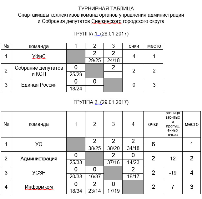 Соревнования по баскетболу проводились по групповой системе, два периода по 10 минут. В результате азартных игр в первой группе первое место завоевала команда Управления физической культуры и спорта, во второй группе бесспорным лидером оказалась команда Управления образования. Эти команды будут встречаться в финальных играх за Iи IIместа. За IIIместо в финале поборется сборная команда Собрания депутатов и КСП, а соперником будет команда администрации города Снежинска.