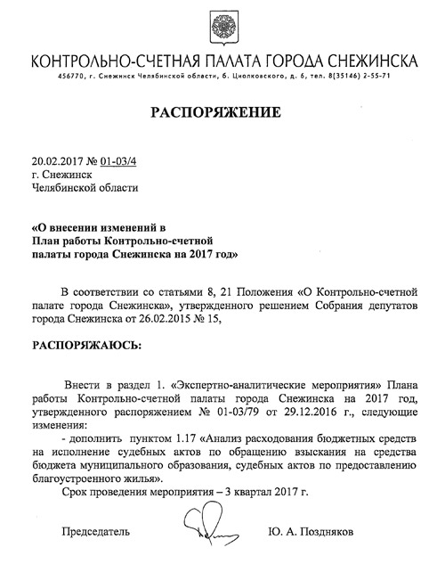 Распоряжение № 01-03/4 от 20.02.2017 «О внесении изменений в План работы Контрольно-счетной палаты города Снежинска на 2017 год» 20-02-2017