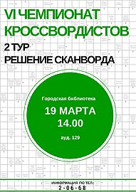 19 марта, в 14:00, в городской библиотеке состоится второй тур. В этот раз участникам предстоит решить сканворд. На его решение будет дано определенное время. При этом использование подсказок, то есть словарей, справочников и Интернета, не допускается.