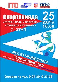 25 марта 2017 года в стрелковом тире состоится 7 заключительный этап второй Спартакиады «Готов к труду и обороне» «Пулевая стрельба». Начало соревнований – в 10:00.