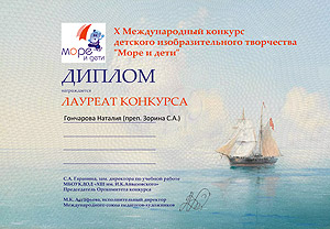 Гончаровой Наталье (преподаватель Зорина С.А.) присужден диплом и звание лауреата Х Международного конкурса детского изобразительного творчества «Море и дети».