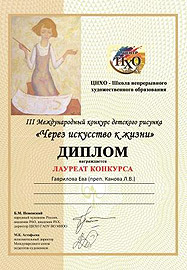 Дипломы и звание лауреатов III Международного конкурса детского рисунка «Через искусство – к жизни» присвоены Гавриловой Еве (преподаватель Канова Л.В.) и Корниловой Дарье (преподаватель Зорина С.А.).
