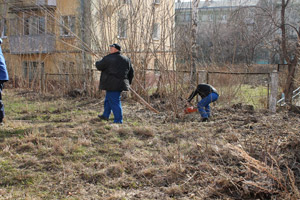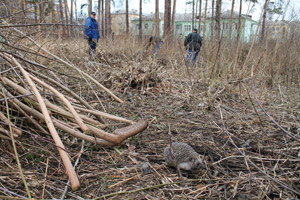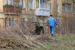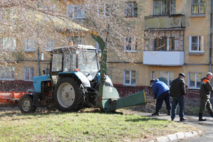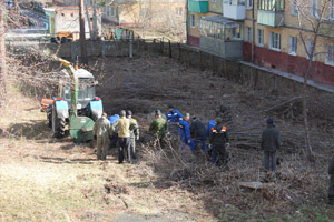 С утра 24 апреля началась активная работа по расчистке территории Снежинской детской художественной школы от зарослей кустарников и подлеска, в котором, как оказалось, мирно проживал… еж, разбуженный шумом бензопил и решивший на время удалиться. На следующих день, 25 апреля, прибыла тяжелая техника для измельчения древесины в щепу, и кучи складированных накануне вырезанных деревьев и кустов за несколько часов слаженной работы «шефов» растаяли без следа.