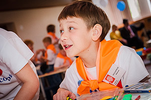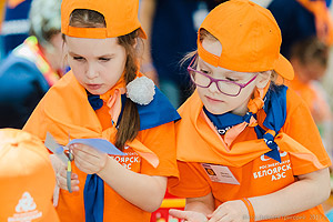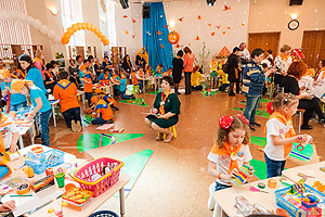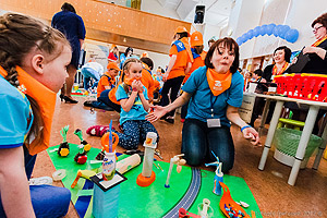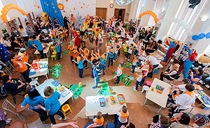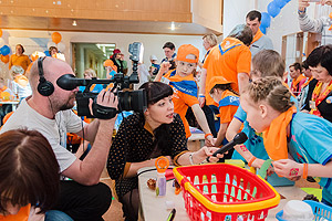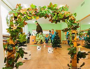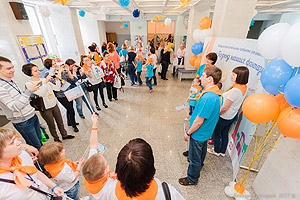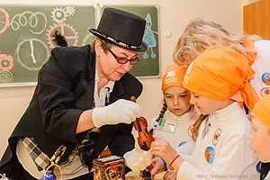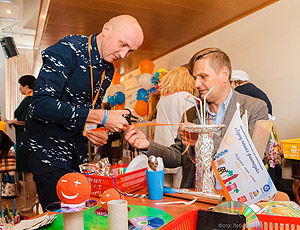 Чудеса для участников финала образовательного события начались уже у парадного подъезда Дворца творчества. Всех встречали и приветствовали сказочные домики – флешка, мороженое, торт, паровозик, гриб, чайник, печка, смайлик, замок, музыкальный и на курьих ножках! Каждому ребёнку подарили значок и флажок с эмблемой мероприятия, а участников отличали ярко-оранжевые банданы и браслеты с эмблемой «Школы Росатома».