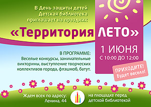 1 июня, с 10:00 до 12:00, на площадке перед Детской библиотекой состоится праздник, посвященный Дню защиты детей «Территория ЛЕТО». Гостей праздника будут встречать сказочные герои Баба-Яга и старуха Шапокляк, которые вместе с детьми погрузятся в занимательный мир конкурсов и весёлых игр. Также перед зрителями выступит студия детского эстрадного танца «Стрекоза» и состоится флэшмоб.