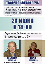 26 июня, в 18:00, в Городской библиотеке (пр. Мира, 22, ауд. 129) пройдет творческая встреча с российскими писателями (г. Москва, г. Санкт-Петербург). К нам приедут: