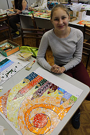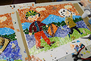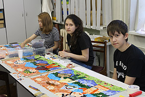 Пока шла эта подготовка, школа закупила весь необходимый материал: цветное стекло, резаки, сетку, специальный клей, и многое другое. Теперь можно было приступить к выкладыванию мозаики на бумажных трафаретах. Это напоминает собирание пазла, с тем лишь различием, что можно самому подрезать кусочек стекла до необходимой формы.