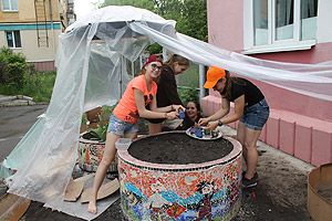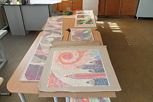 По правде говоря, объем фактической работы поразил даже руководителя проекта, но отступать уже некуда. Работа в классах по заполнениям трафаретов идет полным ходом, кольца сохнут после специальной обработки. Близится завершающий этап – перенос мозаики на улицу и приклеивание на кольца. Теперь все будет зависеть от уральской погоды.