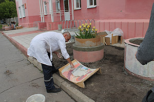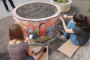 Преподаватель художественной школы, Игорь Юрьевич Суставов, сконструировал специальные формы для нанесения клея на полотно мозаики. Территория у входа в школу все больше становилась похожа на строительную площадку: ведра с раствором и клеем, опалубка, мастерки и шпатели, мешки с сухими смесями и многое другое.