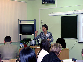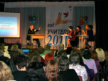 А далее участницы провели тридцатиминутный педагогический совет, представив свой проект «Информационная поддержка учителей, работающих с одаренными детьми», получив при этом полную поддержку зала. А в открытой дискуссии с начальником Управления образования Борисом Михайловичем Беккером состоялось яркое и неординарное обсуждение роли современного учителя в современной школе.