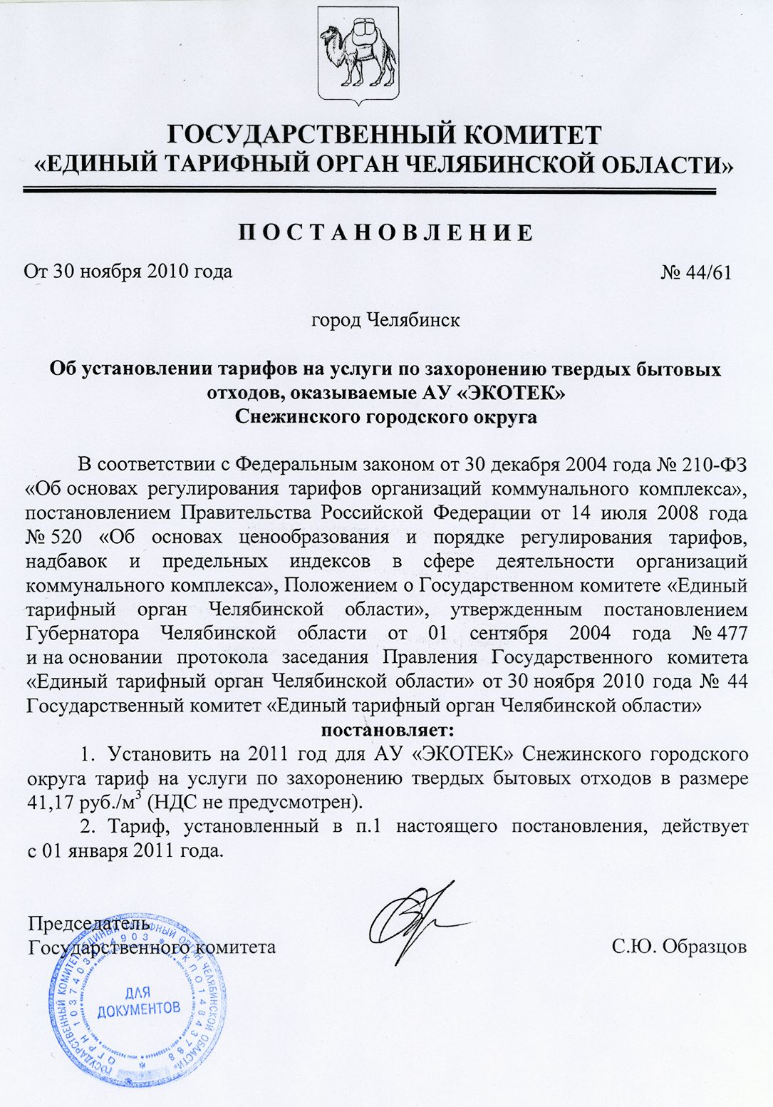В соответствии с Федеральным законом от 30 декабря 2004 года № 210-ФЗ «Об основах регулирования тарифов организаций коммунального комплекса», постановлением Правительства Российской Федерации от 14 июля 2008 года № 520 «Об основах ценообразования и порядке регулирования тарифов, надбавок и предельных индексов в сфере деятельности организаций коммунального комплекса», Положением о Государственном комитете «Единый тарифный орган Челябинской области», утвержденным постановлением Губернатора Челябинской области от 01 сентября 2004 года №477 и на основании протокола заседания Правления Государственного комитета «Единый тарифный орган Челябинской области» от 30 ноября 2010 года № 44 Государственный комитет «Единый тарифный орган Челябинской области»