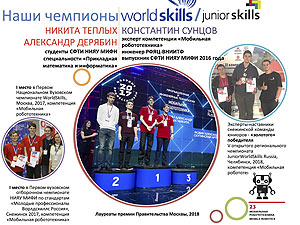 Первый Национальный межвузовский чемпионат WorldSkills Russia прошел в конце ноября 2017 года в Москве. Студенты Снежинского физико-технического института НИЯУ МИФИ стали лучшими в компетенции «Мобильная робототехника». Золото завоевала команда студентов четвертого курса СФТИ НИЯУ МИФИ направления подготовки «Прикладная математика и информатика» (Никита Теплых и Александр Дерябин).