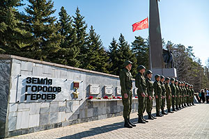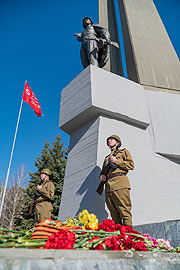 Солнечное, тёплое девятимайское снежинское утро. К назначенному времени горожане спешат к площади Победы, где у Вечного огня у подножия памятника Воину-победителю и мемориальных досок городов-героев выстроился торжественный караул войсковой части № 3468 в исторической форме военных лет.