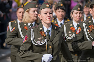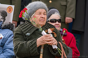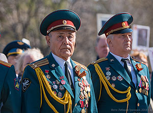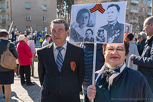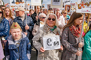 Взрослые с детьми, семейные пары, молодые семьи с колясками – все несут портреты воевавших родственников, цветы, воздушные шары. Практически у всех на лацкане – георгиевская лента, малыши – в военных пилотках с красной звёздочкой; лентами и цифрами «9» украшены даже коляски.