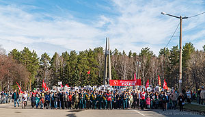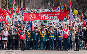 Бессмертный полк начинает движение от площади Победы, словно неторопливая полноводная река, а к ней с улиц и дворов на протяжении всего пути стремятся новые и новые «ручейки» участников. На фоне белого «моря» поднятых вверх портретов ярко реет красный стяг с белым журавлём – символом наших солдат, не вернувшихся с полей сражений.
