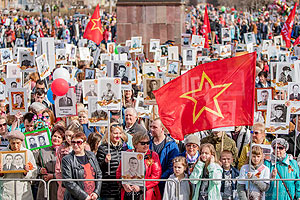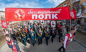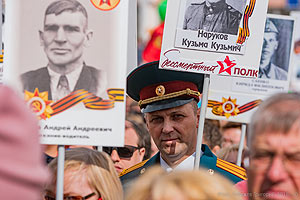 И вот «река» вливается на площадь. Идёт Бессмертный полк солдат, офицеров, медсестёр, военных шофёров, тружеников тыла – всех тех, кто сражался и работал за победу, не щадя своей жизни, кто остался на портретах вечно молодым.