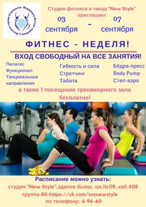 Федерация фитнес-аэробики и фитнеса города Снежинска приглашает женщин (18+) в студию женского фитнеса NewStyle попробовать различные направления групповых программ. Также к вашим услугам женский тренажёрный зал.