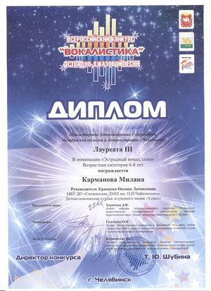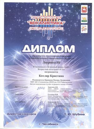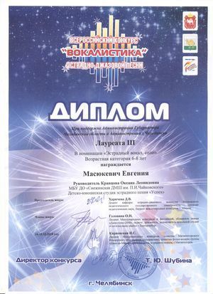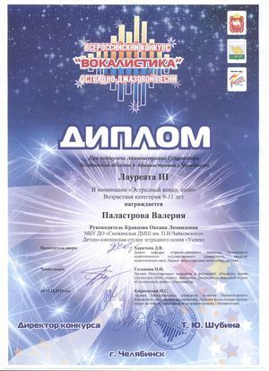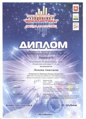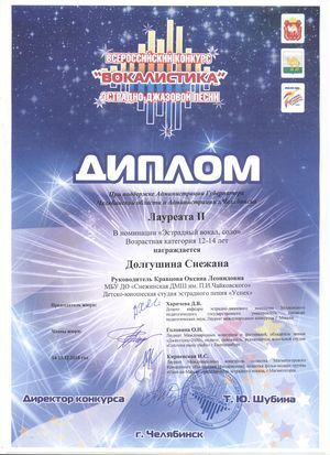 Лучшей из лучших стала руководитель студии эстрадного пения «Успех» Оксана Леонидовна Кравцова, она получила диплом «Лучший руководитель». Её воспитанники, учащиеся Снежинской ДМШ и выпускники прошлых лет, стали лауреатами и дипломантами конкурса.