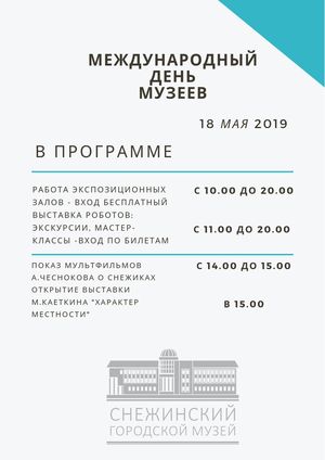 – фотовыставка «Снежинск! Город-сказка, город-мечта!»: взгляд снежинских фотографов на события 2018 – начала 2019 годов (экспонируется 78 фоторабот и коллекция фотоаппаратов из фондов музея). Соорганизатор – некомерческая организация «Снежфото».