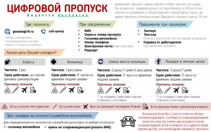 Получить пин-код можно будет через Региональный портал госуслуг gosuslugi74.ru, заполнив электронное заявление. Пин-код придет в личный кабинет пользователя и на его электронную почту. В отдельных случаях, например, для тех, кто не имеет доступа в Интернет, но хочет сменить место самоизоляции или поехать в больницу, предусматривается возможность обращения в call-центр для приема обращений по выдаче цифровых пропусков.