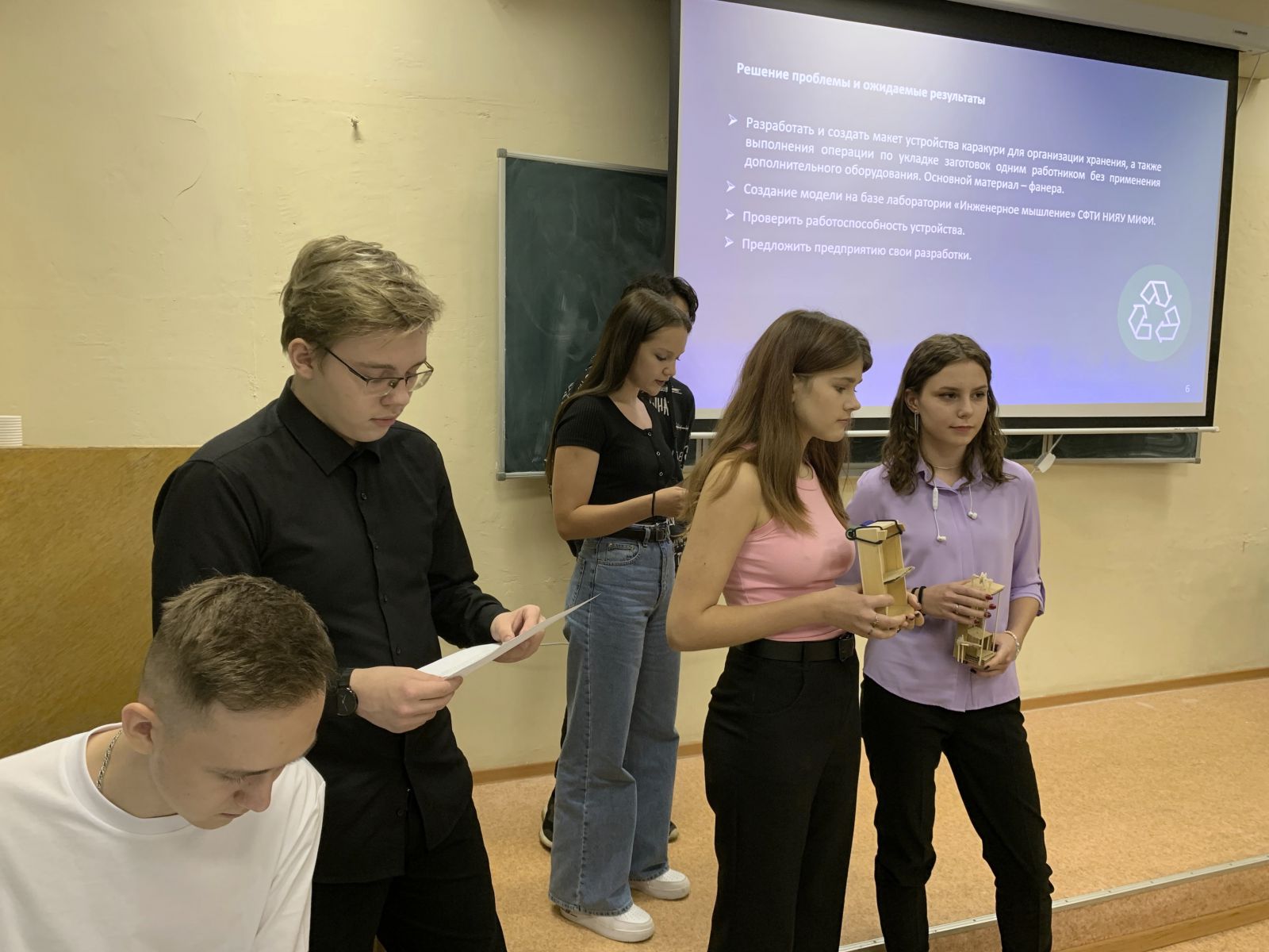 4 октября огромная проектная команда представила свои наработки по проектам: все уже успели углубиться в тематику, изучили различные источники информации, разработали план действий и прикинули бюджеты. Отдельные установки, например, механизированный укладчик заготовок на производстве, были представлены в виде макетов, некоторые - установка для исследования ускорения свободного падения тел различной плотности фотоэлектрическим методом или «умная» теплица – в виде схем.