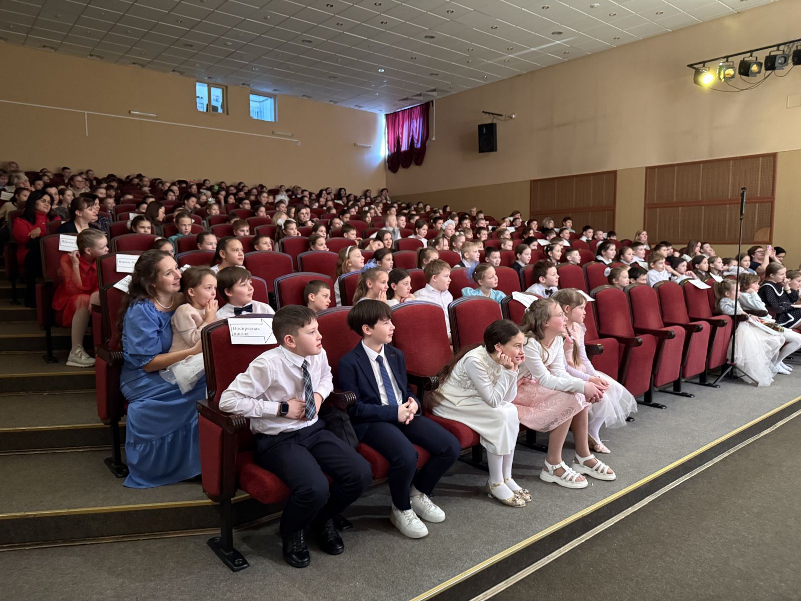 Вторая часть праздника началась в зрительном зале. С видеоэкрана детей поздравил Губернатор Челябинской области Алексей Текслер: