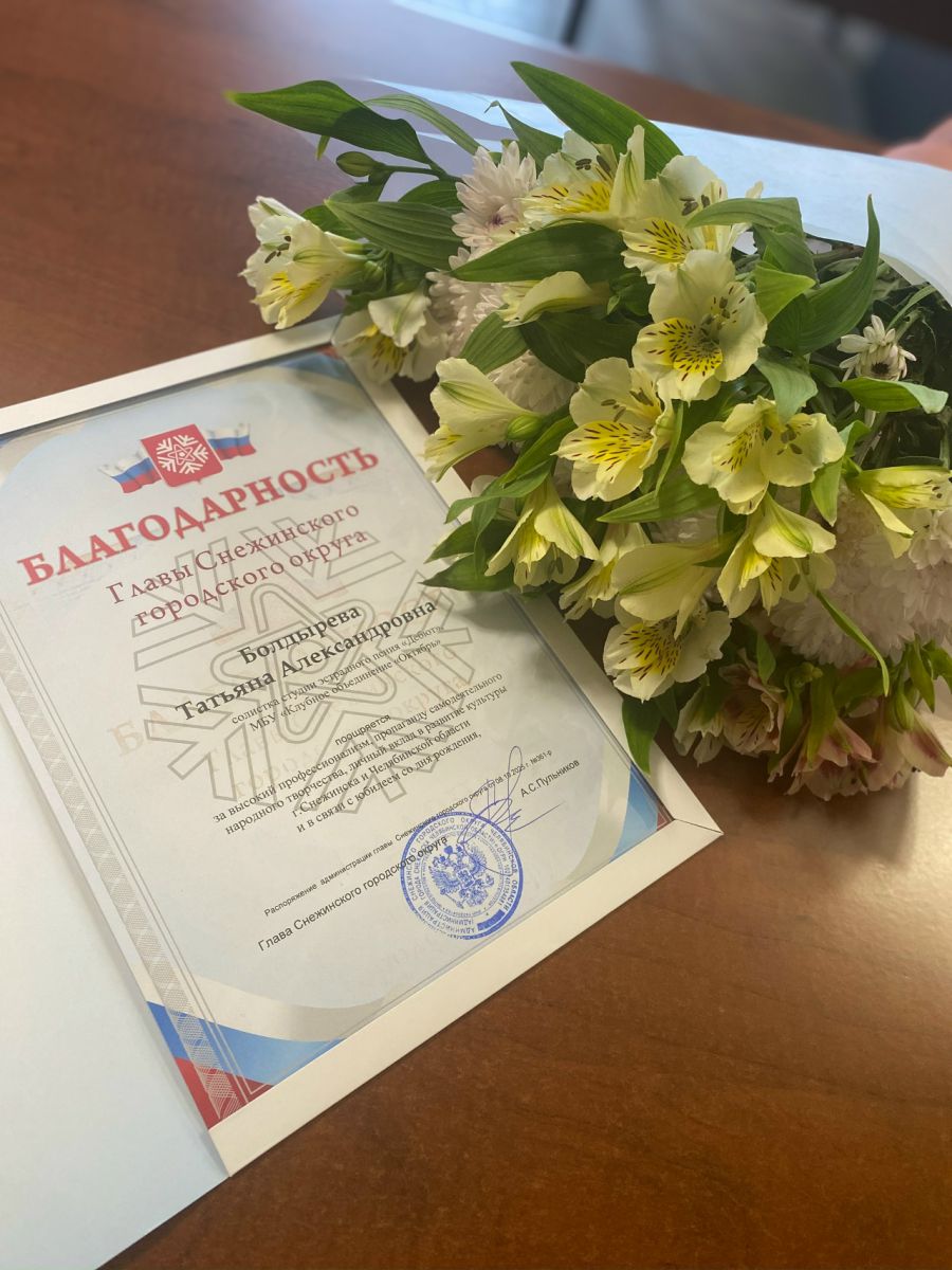 Татьяна Болдырева отмечена благодарностью главы Снежинского городского округа А.С. Пульникова за высокий профессионализм, пропаганду самодеятельного народного творчества, личный вклад в развитие культуры г.Снежинска и Челябинской области и в связи с юбилеем со дня рождения. Награда подчёркивает значимость творческого пути и служит признанием заслуг перед культурой родного края и очень символична в день её юбилейного концерта "Если любовь в сердце твоем", который состоится сегодня в 19:00 в зале ДК «Октябрь».