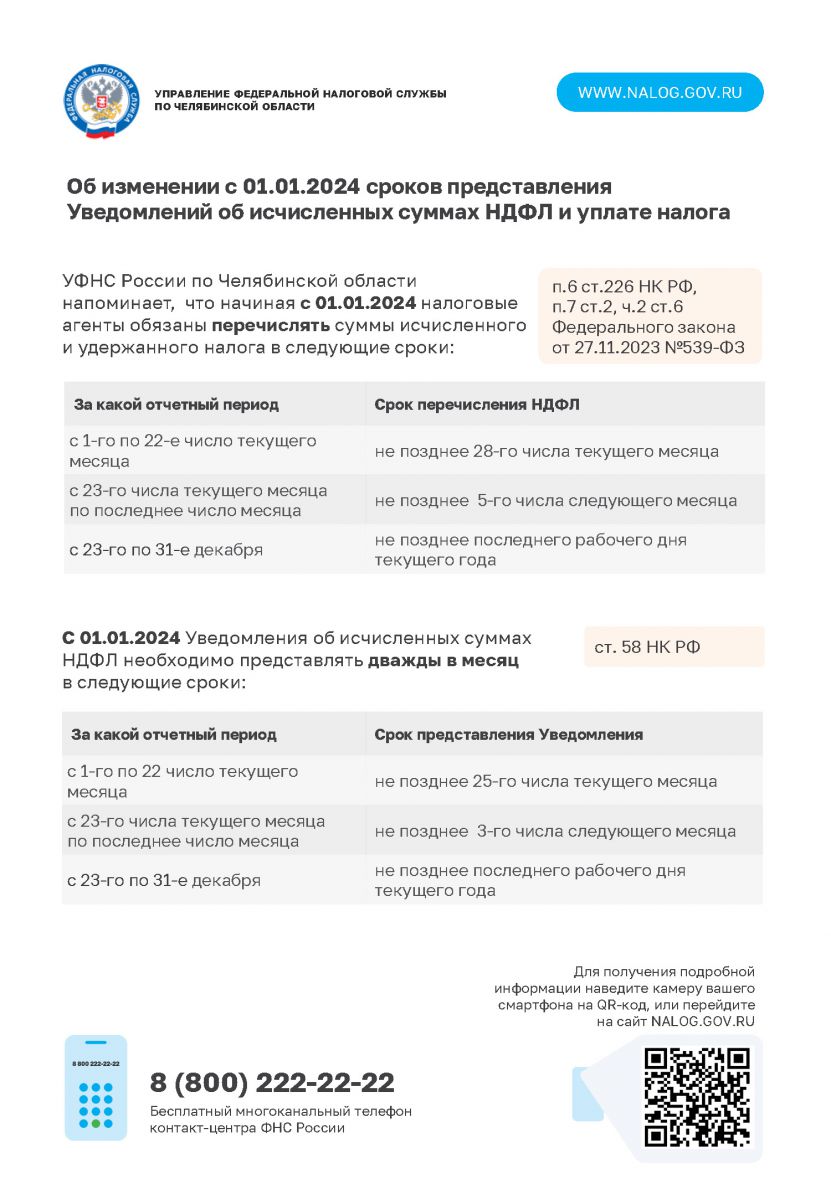 Об изменении с 01.01.2024 сроков представления Уведомлений об исчисленных суммах НДФЛ и уплате налога