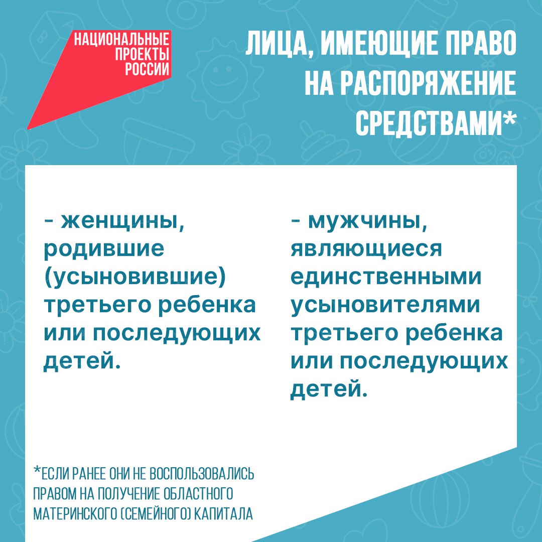 Право на областной материнский капитал имеют семьи, в которых родился третий или последующий ребенок и среднедушевой доход не превышает двукратную величину прожиточного минимума для трудоспособного населения (в 2025 году – 35 564 рублей). Этим правом семья может воспользоваться однократно. В 2025 году размер выплаты составляет 133 364 рубля.