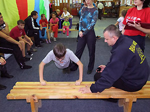 На этот раз ребята состязались в двух этапах. Этап «Гибкий» включал в себяупражнение наклон вперед сидя,этап «Сильный» - вис на перекладине и отжимание от скамьи.