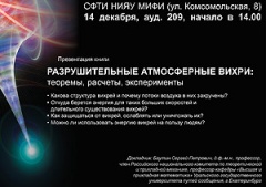 14 декабря в СФТИ НИЯУ МИФИ состоится семинар и презентация книги «Разрушительные атмосферные вихри: теоремы, расчеты, эксперименты». (С. П. Баутин, И. Ю. Крутова, А. Г. Обухов, К. В. Баутин, изд-во «Наука», Новосибирск, «УрГУПС», Екатеринбург, 2013 г.).