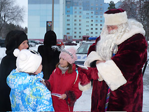 Два дняподряд детей и родителей, спешивших во Дворец творчества на Ёлку, встречали ГАИшный Дед Мороз и юные инспекторы движения.