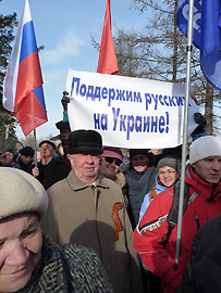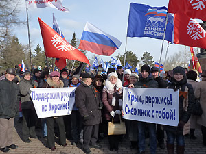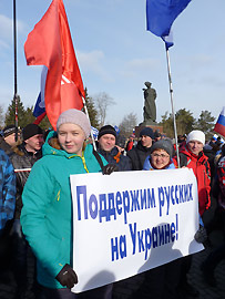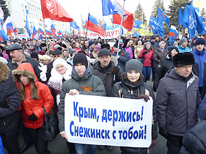 Антонина Васильевна Грыгораш, воспитатель д/с 26: «Я случайно услышала о том, что собирается от Снежинска группа на митинг. Сразу же захотела принять в нем участие и поддержать родную Украину. Я сама приехала с Украины, у меня там живут все родственники, и мне очень больно и страшно за то, что сейчас происходит. Пусть вся наша родня знает, что мы здесь, в России, за всех них очень переживаем и обязательно поддержим!»