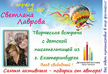 В субботу, 5 апреля, в 12.00 в зале массовых мероприятий детской библиотеки состоится творческая встреча с детской писательницей из Екатеринбурга Светланой Лавровой