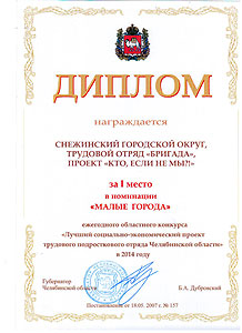 29 октября 2014 года в ДК «Железнодорожник» (г. Челябинск) снежинский трудовой отряд «Бригада» гимназии № 127 был награждён дипломом за победу в номинации «Малые города» ежегодного областного конкурса «Лучший социально-экономический проект трудового подросткового отряда Челябинской области в 2014 году». Гимназисты представили социальный проект «Кто, если не мы?!», изначально одержав победу на муниципальном уровне.