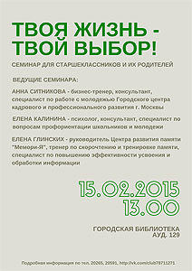 15 февраля, в 13 часов, Городская библиотека приглашает на семинар для старшеклассников и их родителей «Твоя жизнь — твой выбор».