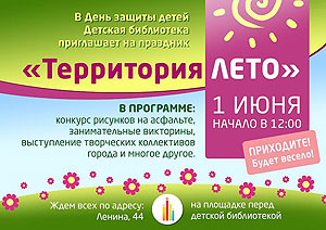 1 июня (понедельник), в 12.00, на площадке перед Детской библиотекой состоится праздник, посвященный дню защиты детей «Территория ЛЕТО». Всех гостей праздника ждет путешествие вместе с Лисой Алисой и Котом Базилио в волшебный мир приключений, выступление вокальных и танцевальных коллективов города, а также множество интересных заданий и викторин.