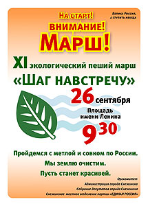 26 сентября, в субботу, в Снежинске состоится очередной, уже 11-й по счёту, экологический пеший марш «Шаг навстречу». В этот раз старт на площади будет дан в 9 часов 30 минут. Как всегда, снежинцы, коллективами и поодиночке, дружно пройдут по старым и новым маршрутам, избавляя природу от накопившегося мусора.