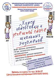 25 сентября в филиале НИЯУ МИФИ в Снежинске состоится общегородское собрание учащихся 9-11 классов, колледжа и их родителей, посвященное набору на курсы подготовки к успешной сдаче итоговой государственной аттестации по физике и математике, проводящейся в рамках Физико-технической школы СФТИ НИЯУ МИФИ. Начало в 18.30, место проведения – актовый зал.