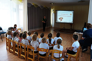 Перед началом занятия инструктор по физическому воспитанию показала детям презентацию и рассказала, что же такое комплекс ГТО. И вот уже после теории дети перешли к практическому занятию.